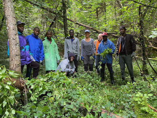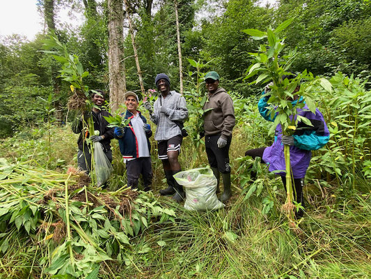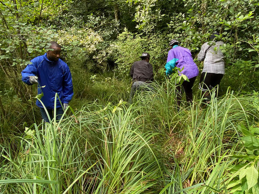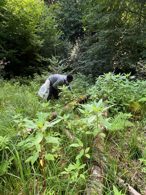 Und so trafen sich am 27. Juli 2023 bei der Tannenlaube ein Dutzend Flüchtlinge aus drei Nationen und ihre Betreuer und Betreuerinnen mit den NAMU-Vorstandsmitgliedern, wurden herzlich willkommen geheissen und in die Aufgabe eingeführt. Im Einsatzgebiet machten sich alle freiwilligen Helfer sehr motiviert an die Arbeit, erkannten schon nach kürzester Zeit die zu jätenden Pflanzen und kämpften sich selbständig durch die stark befallenen Stellen. Es herrschte während des ganzen Morgens eine fröhlich aufgeräumte Stimmung, und es konnte mehr erreicht werden als geplant.